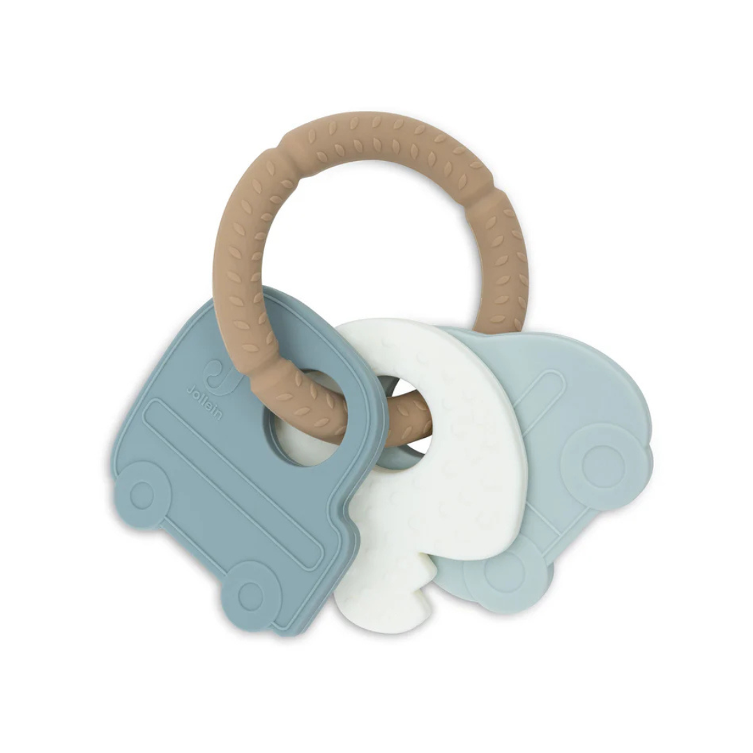 Este llavero de silicona con un coche, una furgoneta y una llave en rosa salvaje, verde mar, caramelo y turrón es un juguete encantador para los pequeños que están en la dentición. El anillo con cuentas ayuda a aliviar el dolor de encías irritadas y las anillas de silicona se fijan fácilmente al cochecito o a la silla del coche. ¡Este mordedor proporciona distracción y también es ideal para jugar en cualquier lugar!