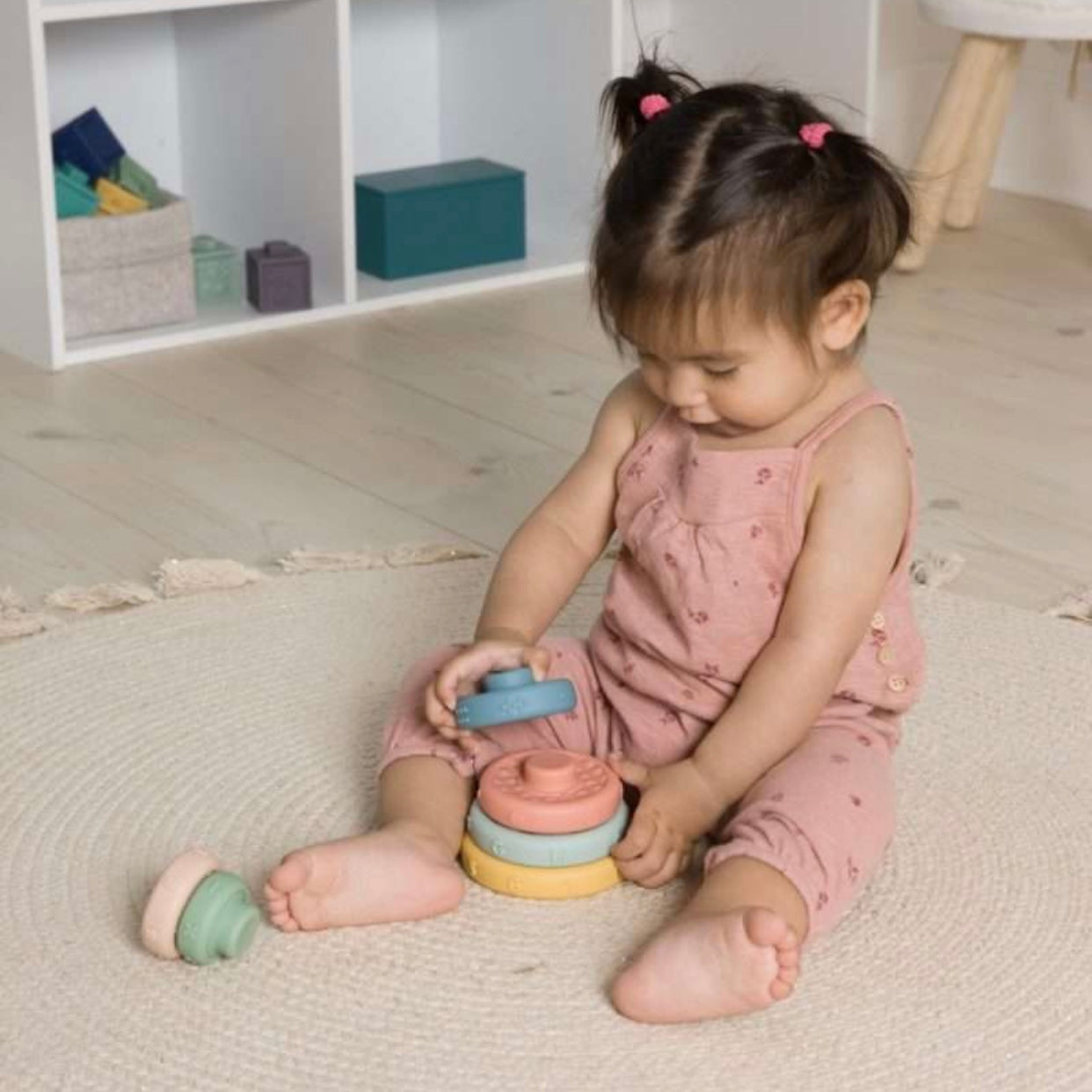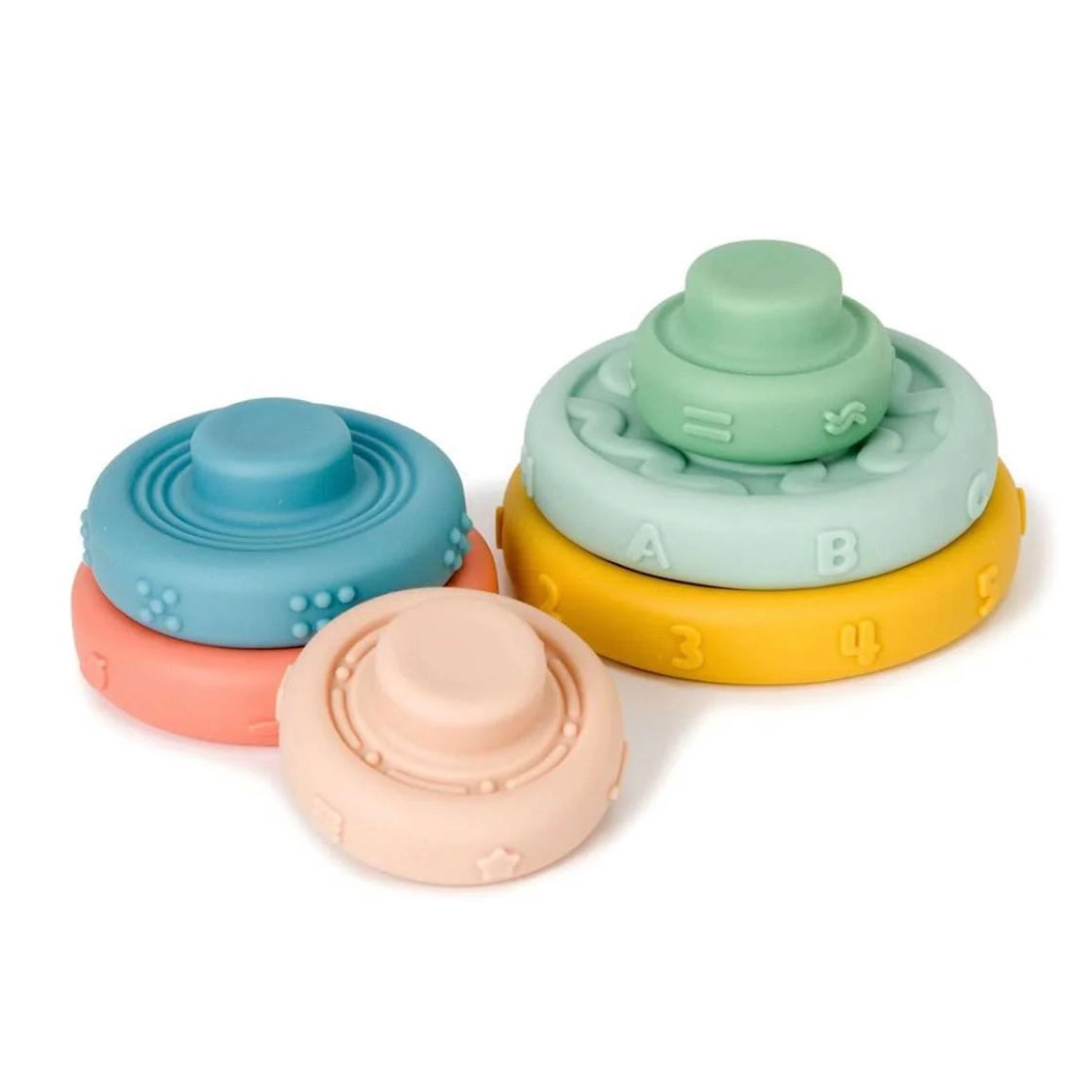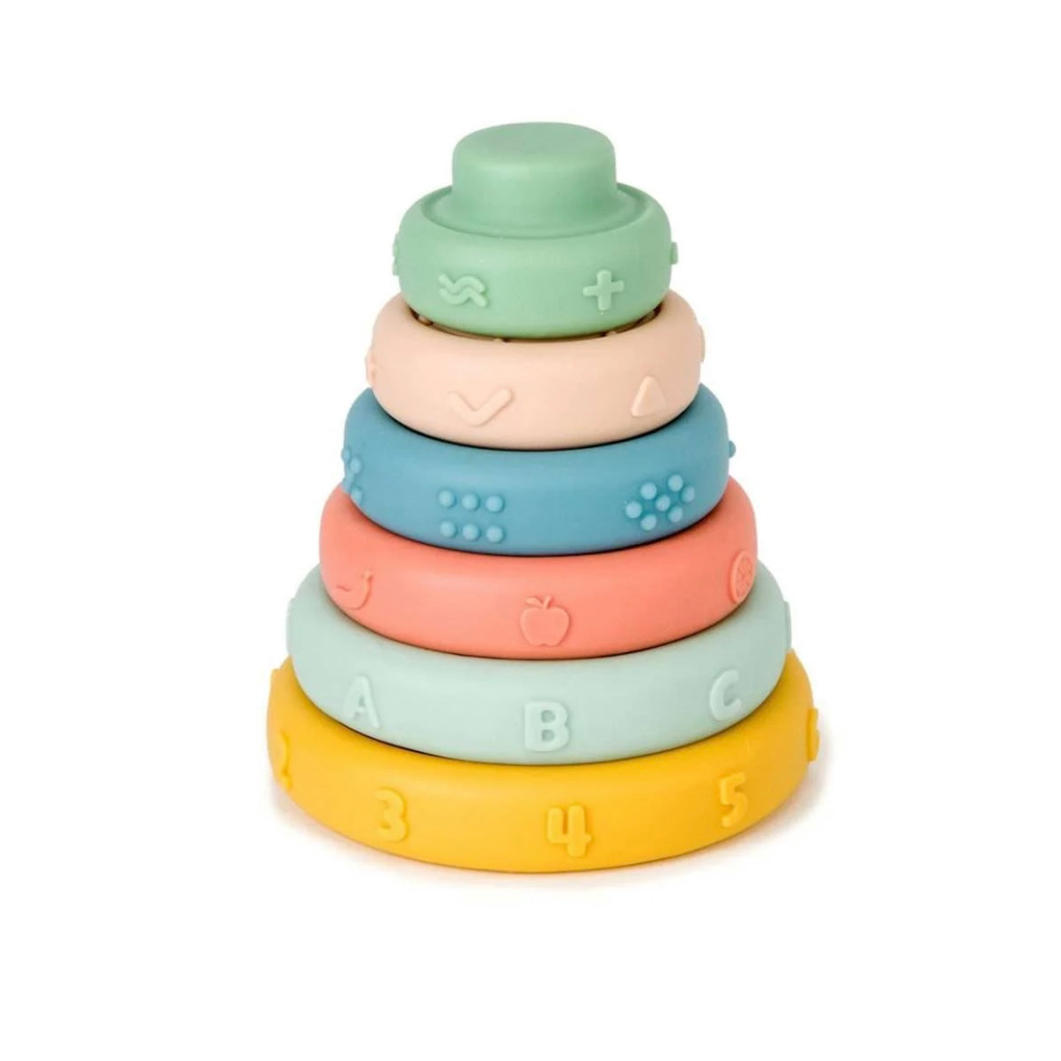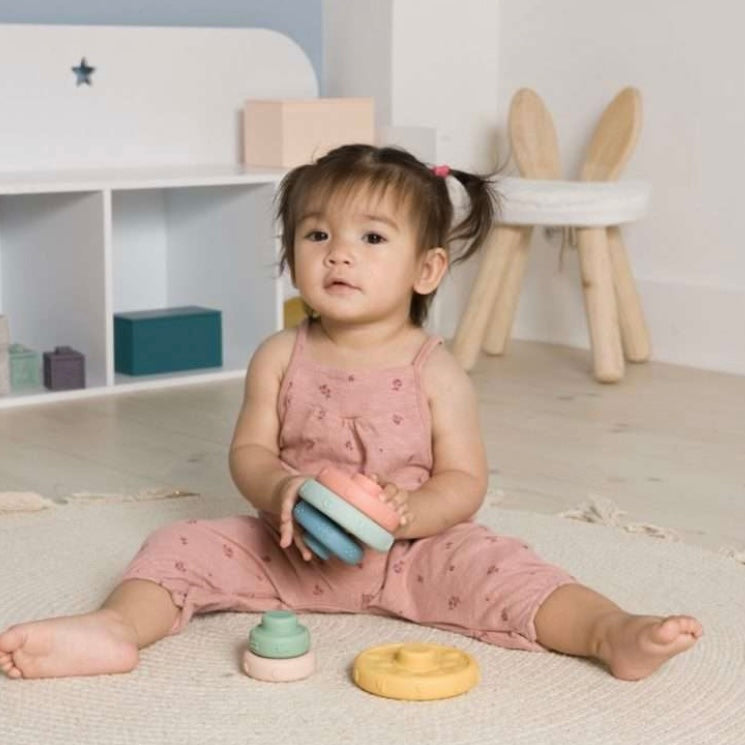 Un juego de 6 anillos para apilar y crear una torre. Cuentan con una textura suave y flexible, con bonitos colores pastel y formas en relieve, ¡a tu hijo le encantará jugar con ellos!