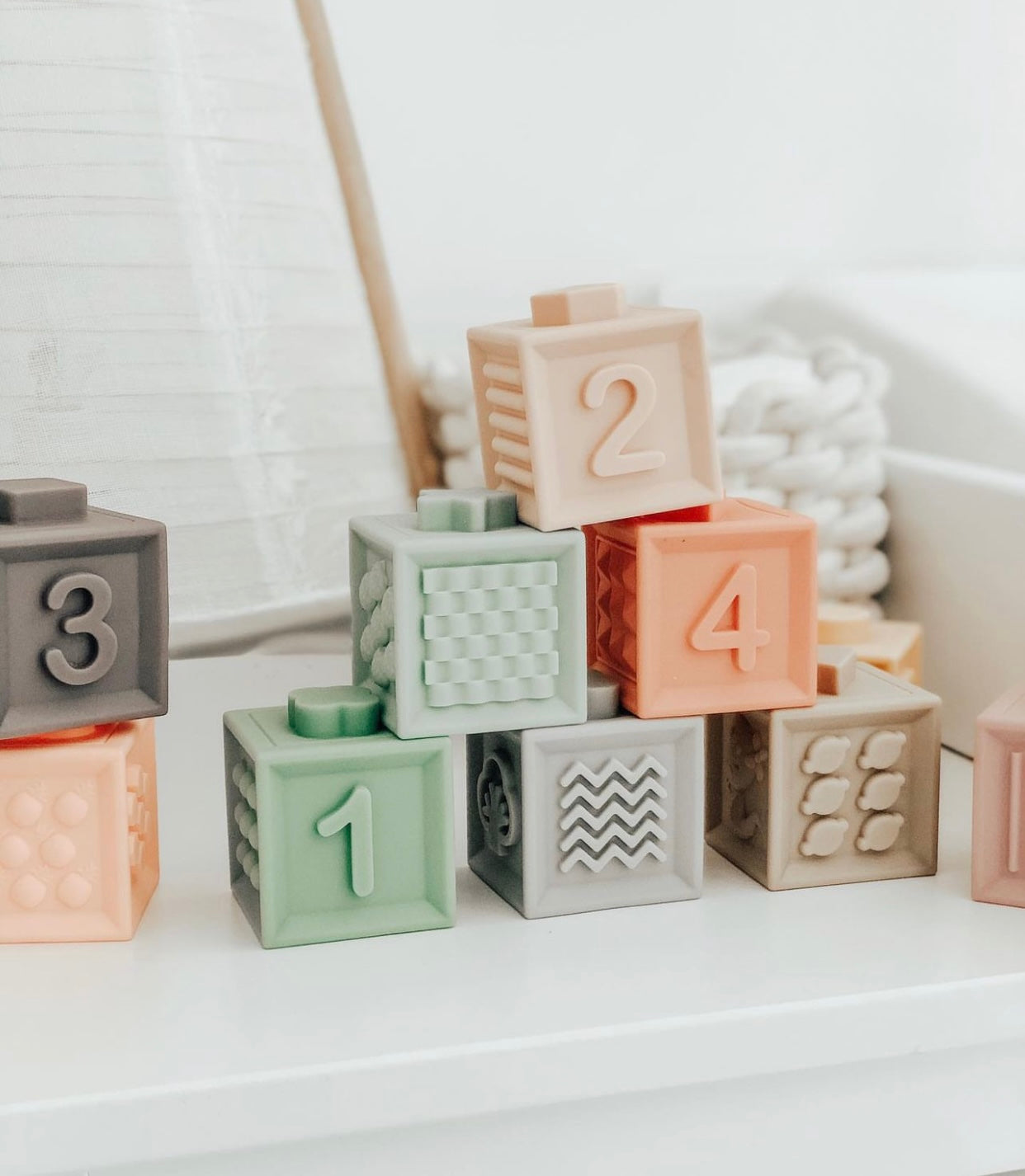 Un juego de 6 anillos para apilar y crear una torre. Cuentan con una textura suave y flexible, con bonitos colores pastel y formas en relieve, ¡a tu hijo le encantará jugar con ellos!