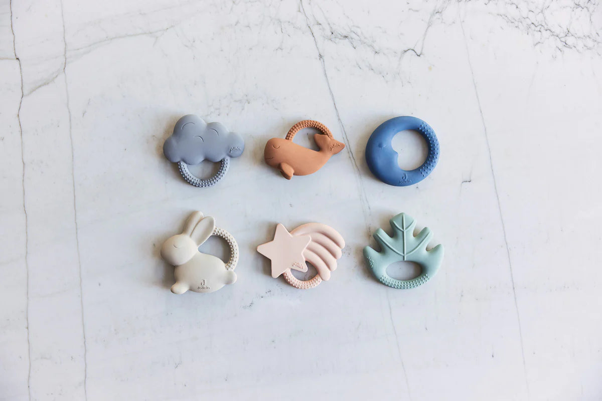 Su bebé puede ponerse este mordedor en la boca para chupar y morder. Durante la dentición, puede ser muy agradable poner el mordedor en el refrigerador antes de usarlo (nunca en el congelador). El anillo de dentición frío adormece ligeramente la sensación desagradable en las encías. Este mordedor está disponible en cuatro formas diferentes. Cada forma viene en su propio color. Cada forma es fácil de agarrar y sostener para su bebé. La dentición puede hacer que su bebé se sienta un poco mal. No es de extrañar, por supuesto: el diente presiona para salir a través de las encías y eso duele o hace que pique. A menudo se puede ver en la boca: un bulto duro y encías rojas o hinchadas. ¡Eso es un trabajo duro para su bebé! Para aliviar un poco el dolor, es bueno que tu pequeño muerda algo. Esto alivia la presión sobre las encías cuando salen los dientes.