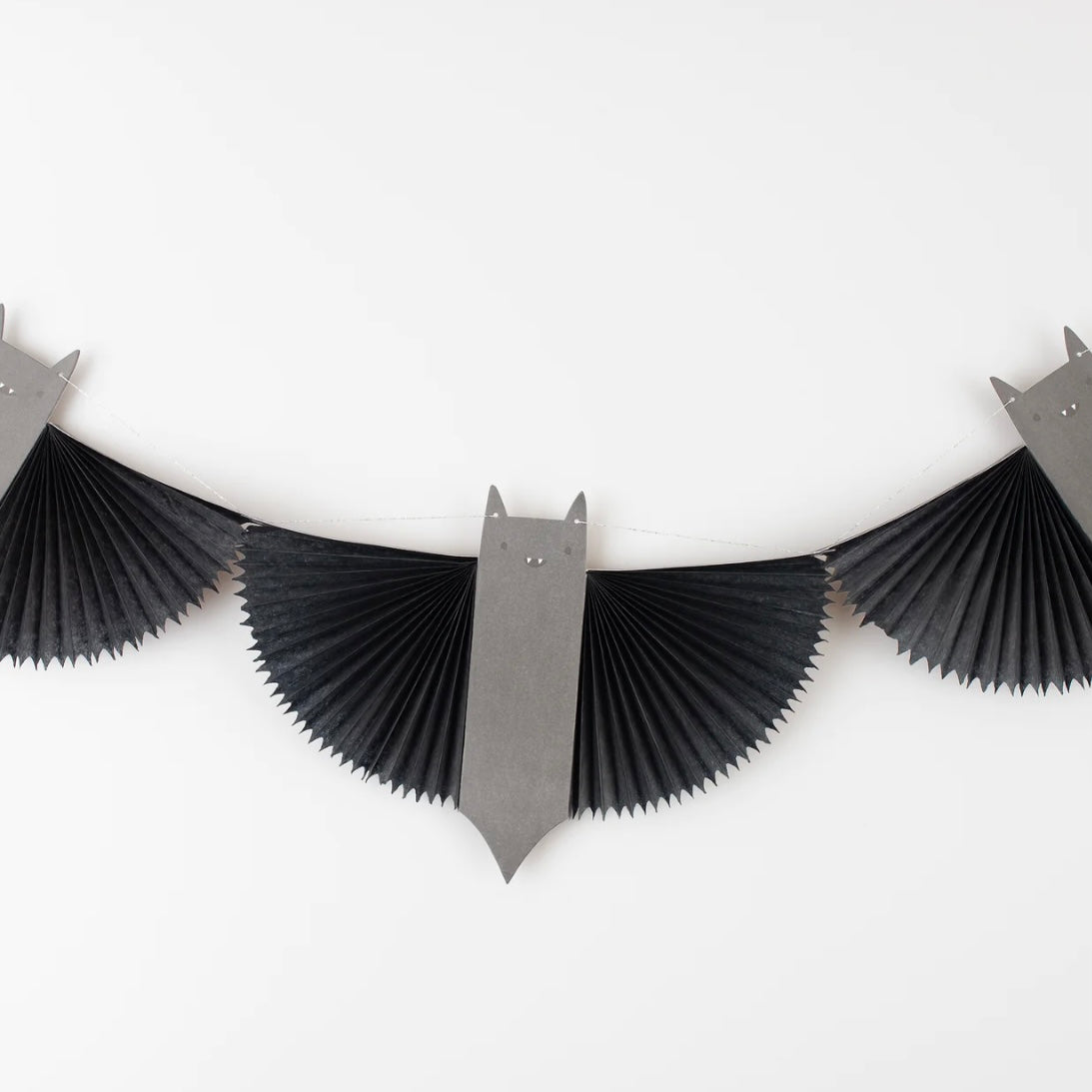 La guirnalda incluye 6 murciélagos de papel preenhebrados en un cordón metálico plateado brillante y tienen alas de papel de seda negro.