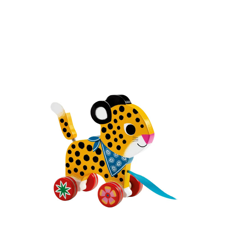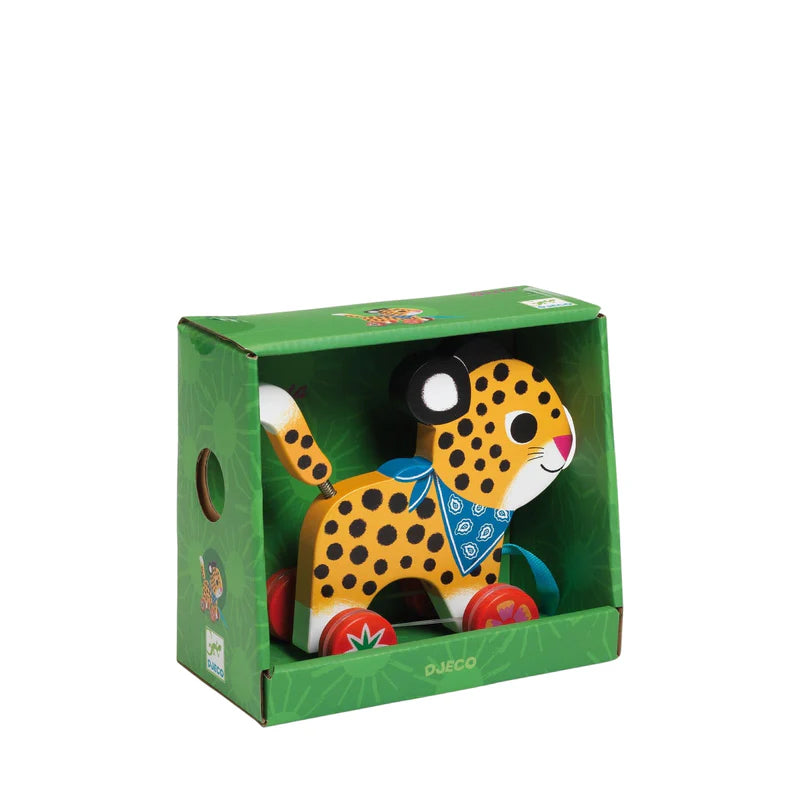 Este bello leopardo está convertido en un juego de arrastre, ideal para arrastrarlo y trasladarlo por donde prefieras.