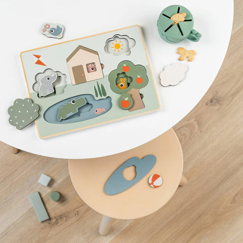 Este divertido rompecabezas es una forma genial de ayudar a tu pequeño a fortalecer sus habilidades motoras finas y la pinza, ya que va levantando cada pieza para descubrir qué hay debajo. También fomenta la imaginación, permitiéndole crear sus propias historias mientras desarrolla su pensamiento lógico y habilidades para resolver problemas.