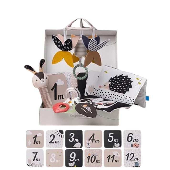 Mejora el tiempo boca abajo con el libro arrugado en blanco y negro para la estimulación sensorial, estimula los sentidos visual y auditivo con el móvil con campanilla de mariposa y fomenta la motricidad fina con el sonajero. Usa el conejito chirriador para una mayor estimulación sensorial. Registra los hitos más preciados con las tarjetas de hitos de doble cara, ideales para capturar momentos adorables.