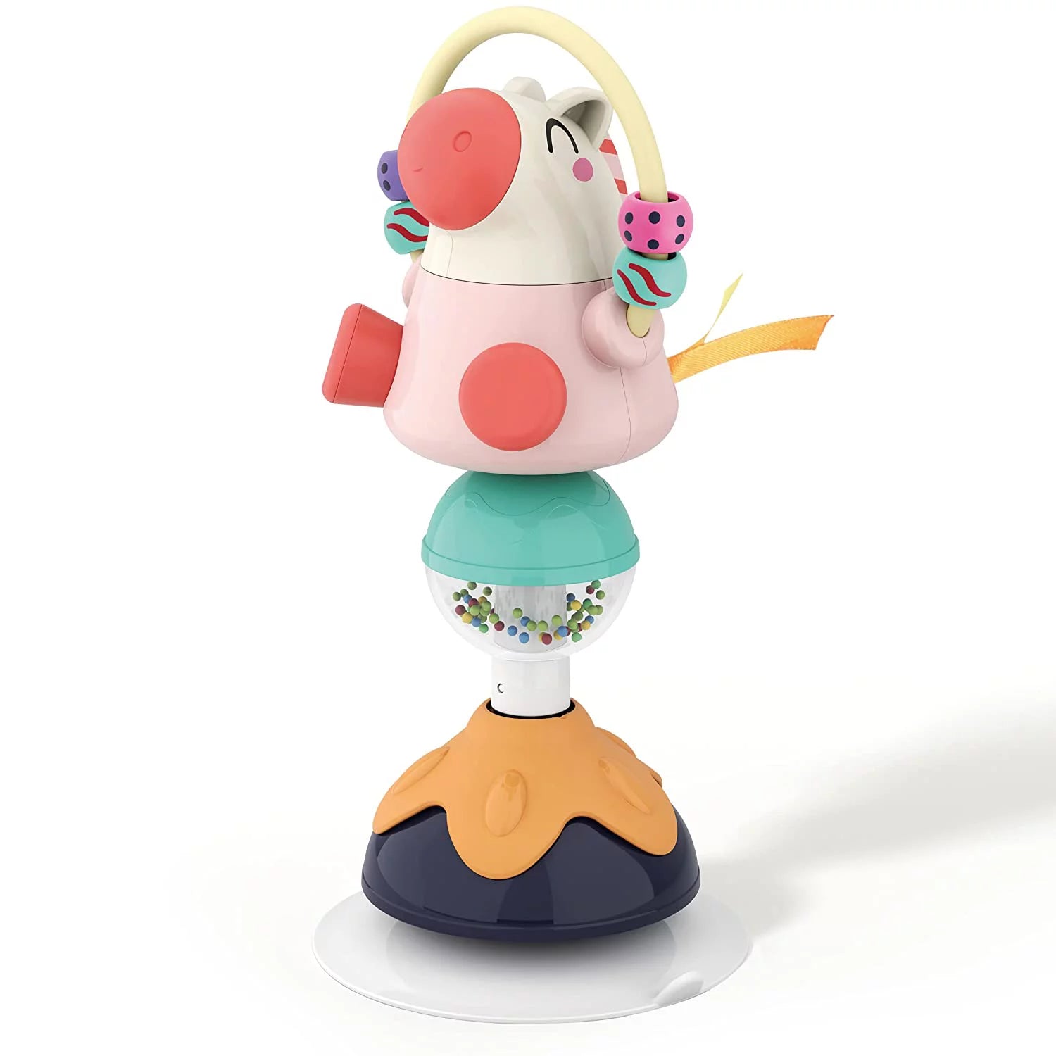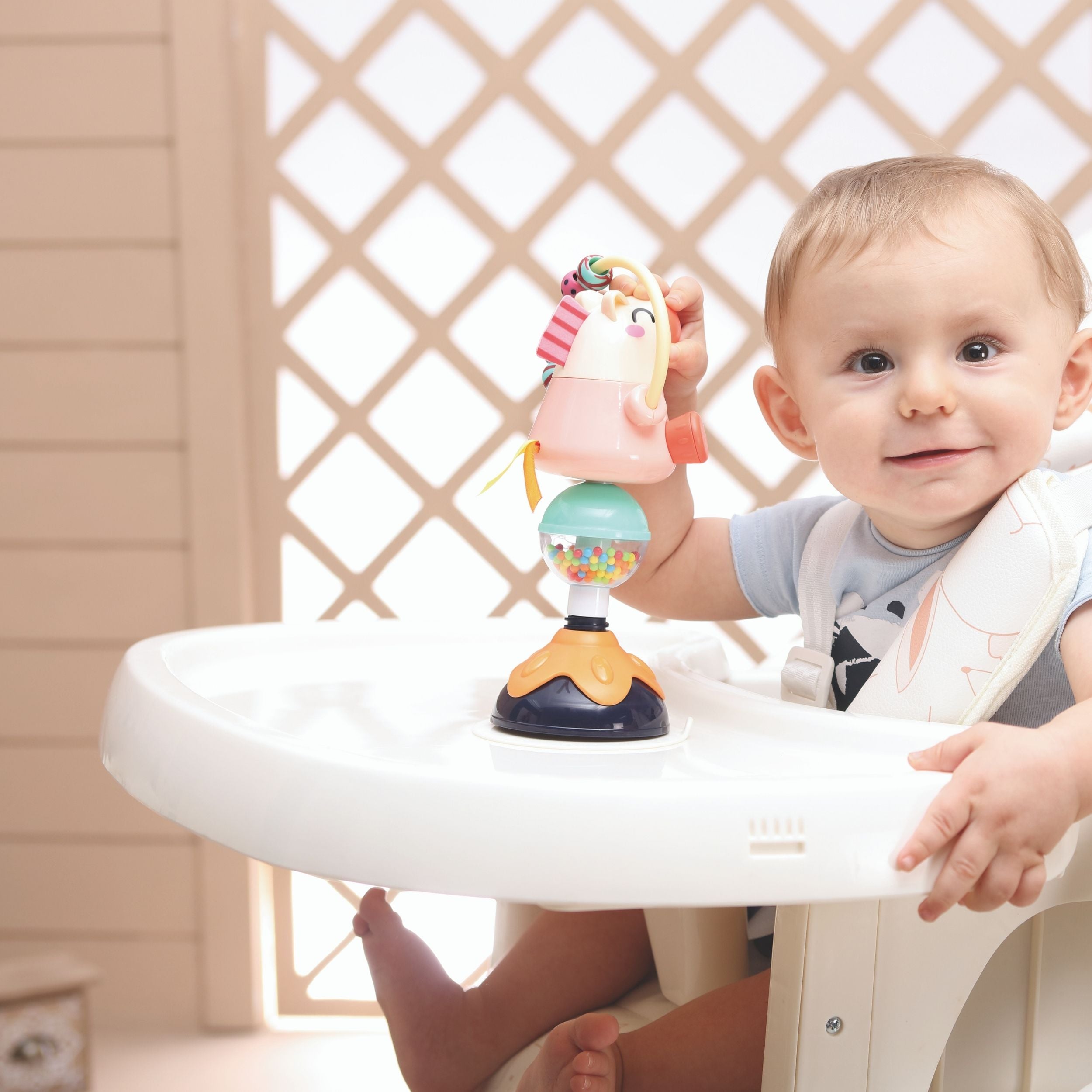 El juguete tiene una ventosa que permite sujetarlo a la mayoría de las superficies planas, incluidas sillas de bebé o mesas.