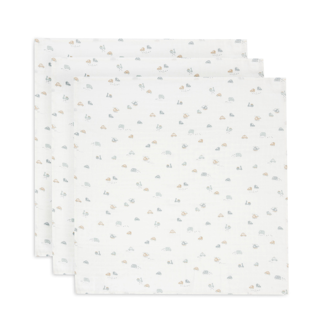 Un arrullo de muselina es un artículo que usarás mucho para cuidar a tu bebé y las posibilidades de uso son infinitas. Estas adorables tutos, con la temática "On The Go", son increíblemente suaves y perfectos para la piel sensible del bebé. Este paquete de 3 incluye varios estampados divertidos de coches, helicópteros y patinetes, en los preciosos colores verde mar y galleta