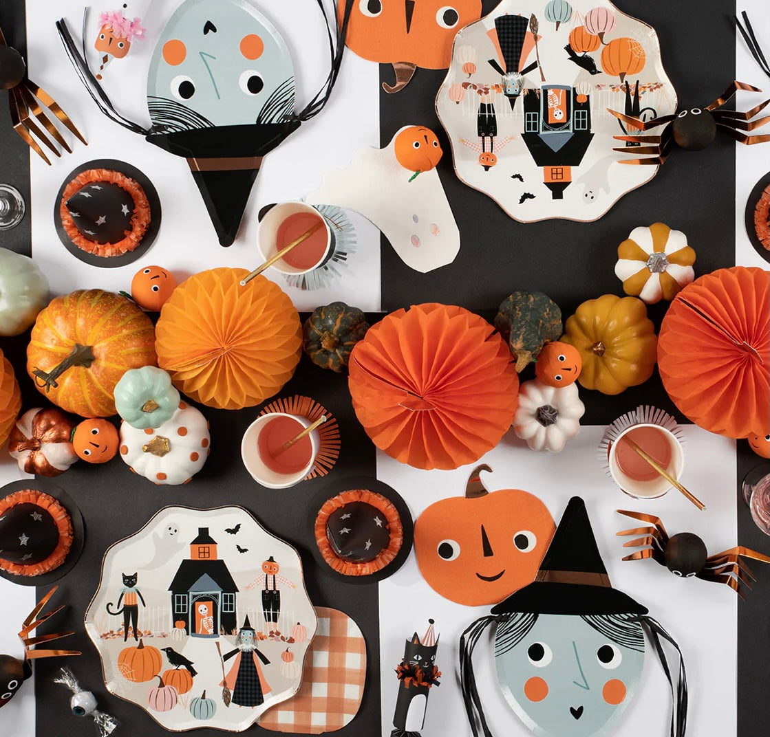 Haz que tu mesa de Halloween tenga un look "familiar" con estos fabulosos platos de Meri Meri con figuras de un huerto de calabazas. Tienen lindas ilustraciones de íconos clásicos Halloween con elegantes detalles estampados a cuadros y tonos de Halloween en negro y naranja.