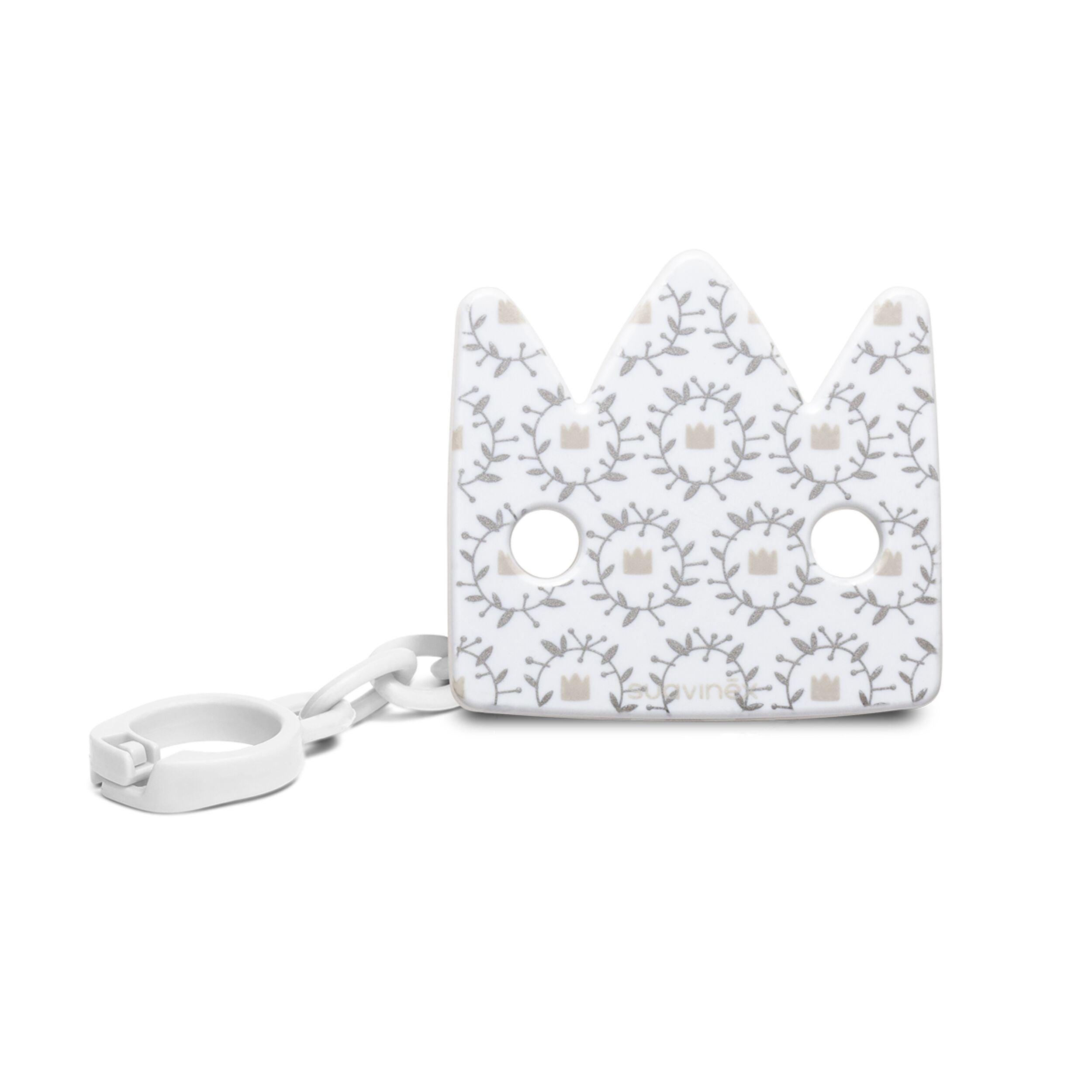 Este porta chupete permite sujetar los chupetes a la ropita del bebé, evitando así que caiga al suelo, se ensucie, o se pierda. La pinza que se sujeta a la ropa lleva unida una argolla en la que introducir el chupete. Para bebés a partir de 0 meses.