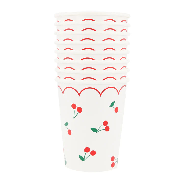 Estos bonitos vasos de papel estampados, con cerezas, hojas verdes y detalles en rojo, le darán un toque elegante a cualquier bebida que sirvas. Son ideales para fiestas en el jardín, picnics o cualquier momento que desees un toque alegre y colorido.