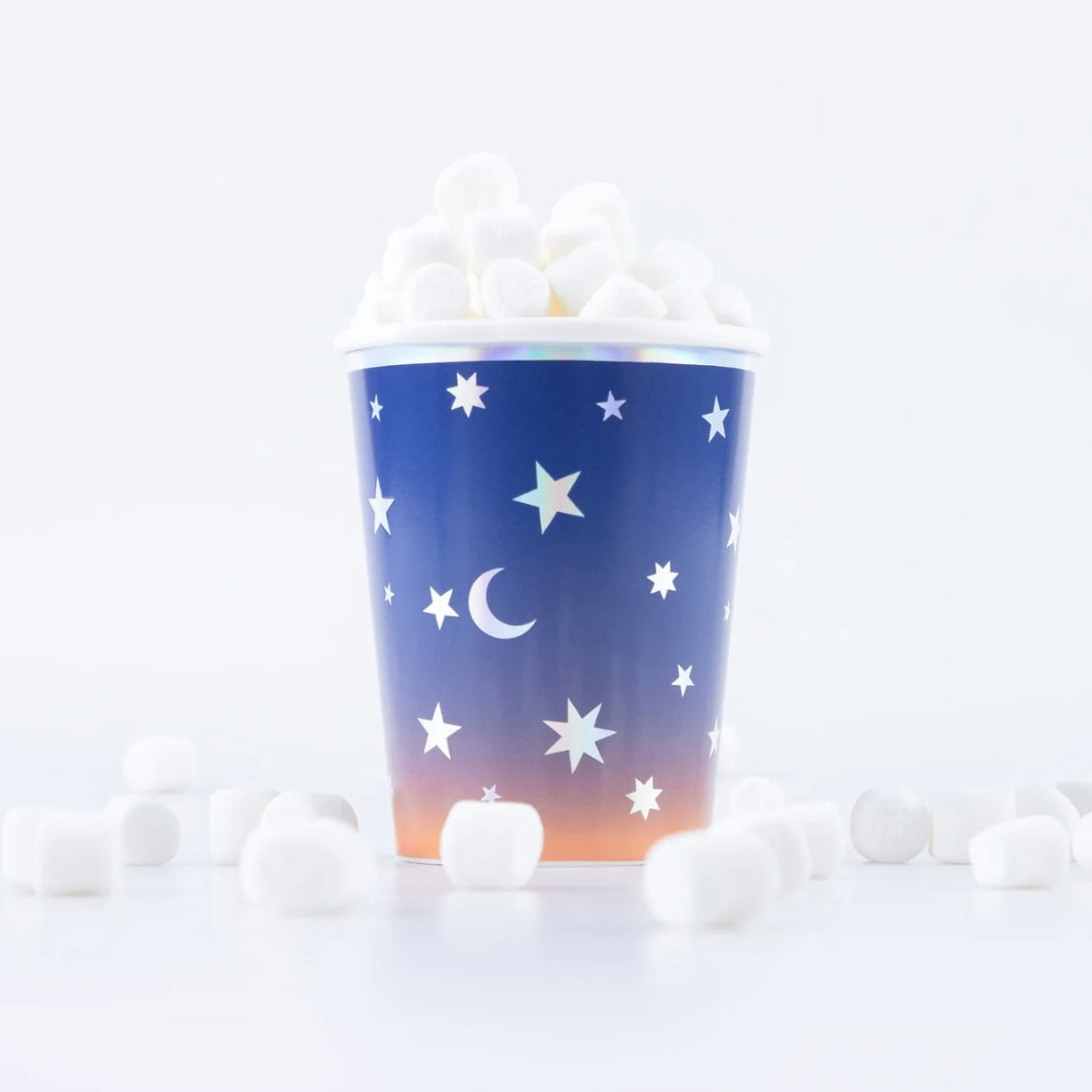 Estos modernos vasos con colores en degradé y estrellas plateadas, capturan mágicamente los cielos del atardecer, lo que los hace ideales para cualquier celebración extraordinaria.